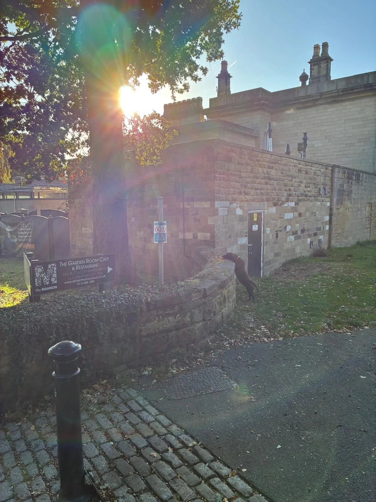 Naturally, I was attracted by the smell of the fruit so I investigated. I couldn't quite reach the fruit so I had to stretch to my full extent. The pup (Phil), who goes for a walk or run and then meets us at the car for a lift home, found this so amusing he took a picture (which I am including) below) and suggested that I looked like an otter (whatever that is).